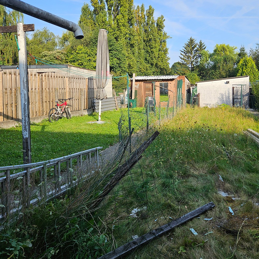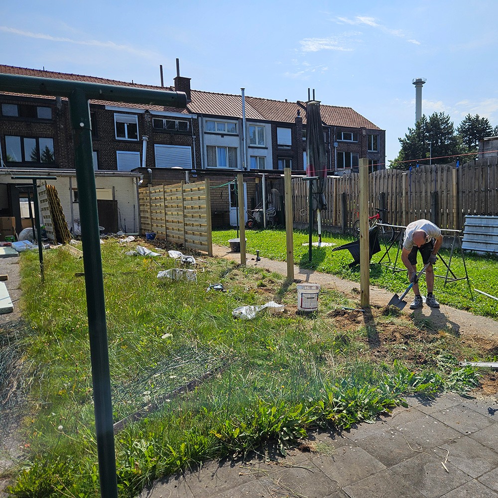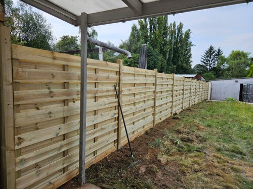 Deze pas geplaatste houten schutting, uitgevoerd in een modern ontwerp met horizontale planken, brengt structuur en rust in de tuin. Het lichte hout en de strakke afwerking zorgen voor een frisse, natuurlijke uitstraling. De net gemaaide grasstrook en de hark tegen de schutting benadrukken de recent voltooide werkzaamheden. In combinatie met de omliggende natuur ontstaat een verzorgd en harmonieus geheel – een stijlvolle afronding van dit buitenproject.